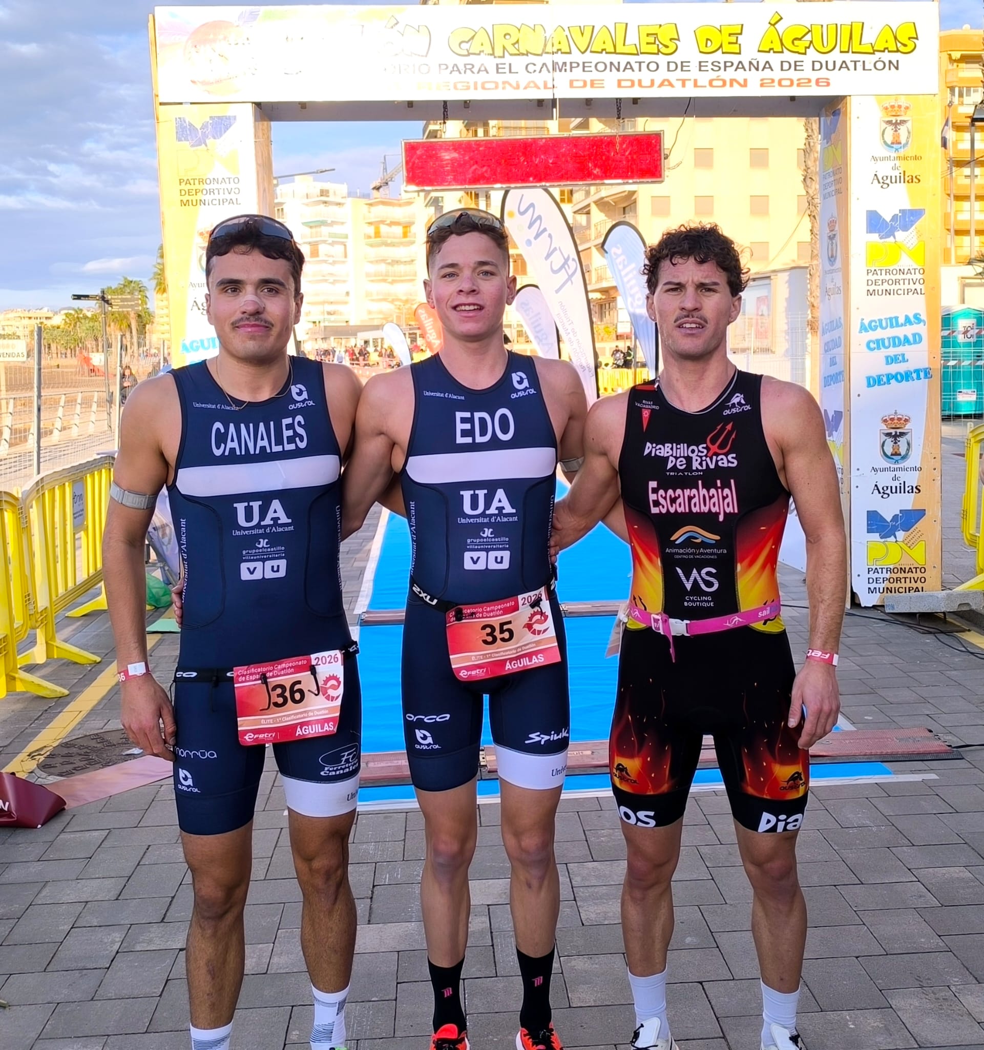 Izan Edo se imponía en la clasificación Élite masculina con un tiempo de 52 minutos y 37 segundos, siendo el más rápido en los dos sectores de carrera a pie, relegando a la segunda plaza a Eloy Canales, también del Universidad de Alicante, con un registro de 52 minutos y 43 segundos; y a la tercera a Saúl Escarabajal, de Diablillos de Rivas, que cerraba el pódium en 52 minutos y 47 segundos. Igor Bellido, de Isbilya Sloppy Joe’s, el parcial más rápido en bici entre los de cabeza, finalizaba cuarto, y Abraham García, del Triatlón Albacete Res, quinto.